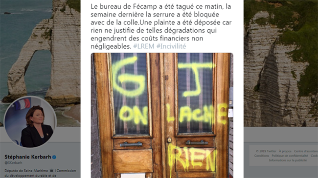 La députée La République en marche (LREM) de Seine-Maritime, Stéphanie Kerbarh, a retrouvé la porte de sa permanence de Fécamp taguée, le 9 juillet au matin. Sur un cliché posté par l’élue sur les réseaux sociaux, on peut lire inscrit, en lettres jaunes, la phrase : «GJ on lâche rien» – GJ étant, de toute évidence, l'acronyme pour «Gilets jaunes».